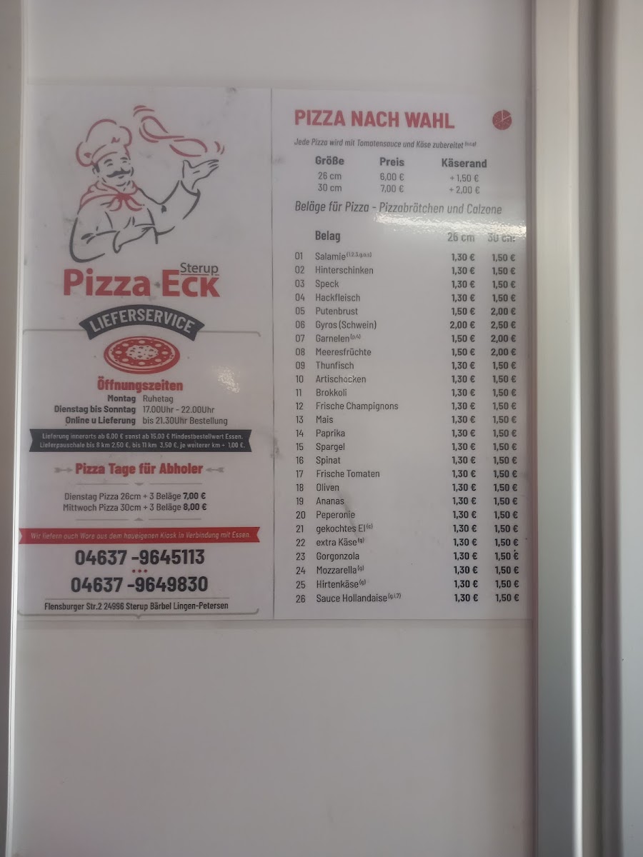 Pizza Eck Sterup delivers a menu that balances simplicity with comfort, making it ideal for casual dining. The pizza selection features the classic Handpizza, the playful Überraschungspizza, and the shareable Pizzabrötchen, each crafted to satisfy both traditional and adventurous tastes. For sides, the restaurant offers Pommes Frites and Kroketten (8 Stück), perfect for pairing with a pizza or enjoying on their own. Complementing the dishes are flavorful condiments like KetchupMayonnaise and Knoblauch Sauce, which add a personalized touch to each bite. Overall, the menu reflects a straightforward yet satisfying approach, where each item-from the individual hand-sized pizzas to the crunchy sides-delivers value and comfort without overcomplication, making Pizza Eck Sterup a dependable choice for a quick, tasty meal.